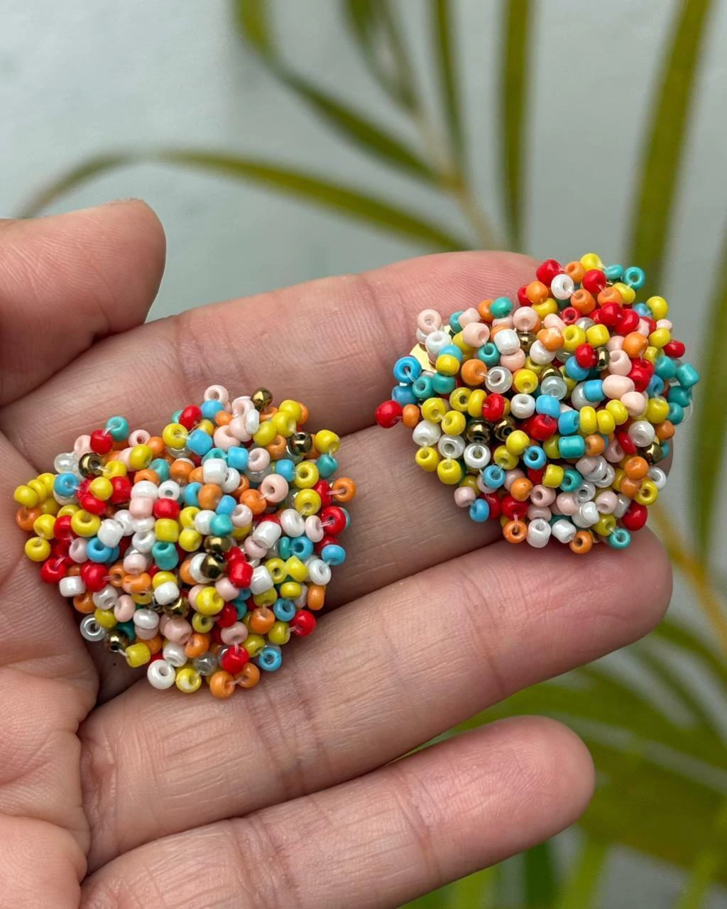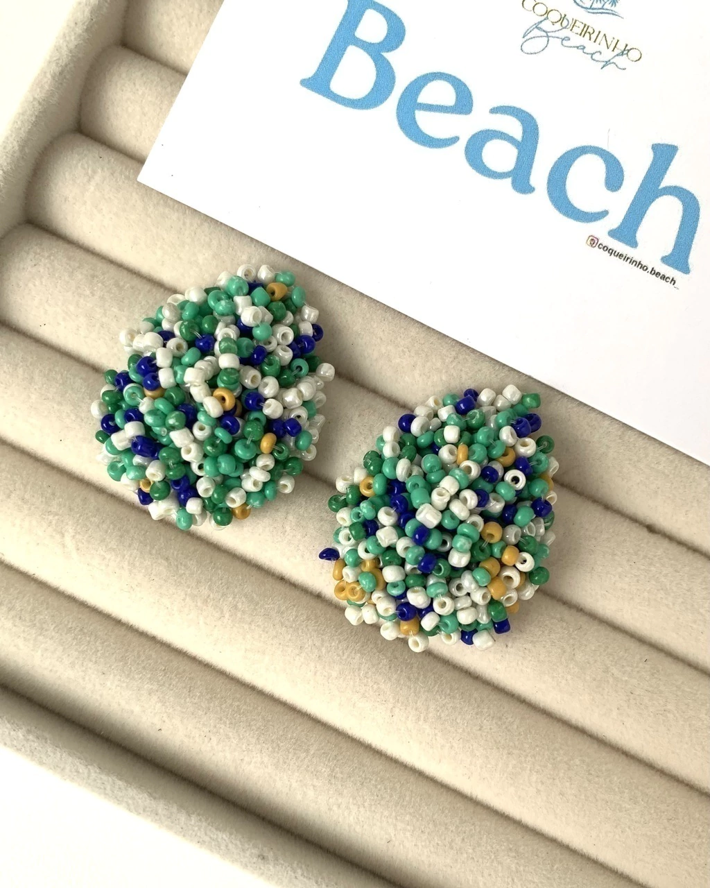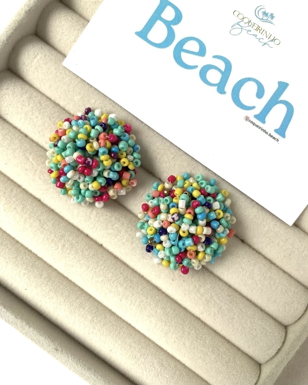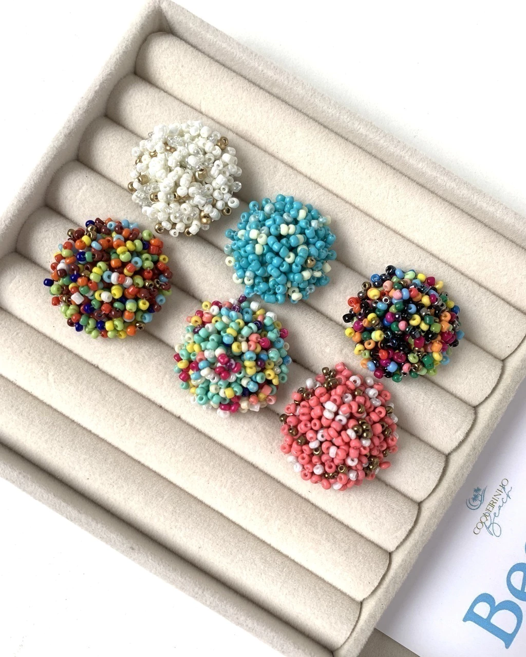 Em formato de botão revestido por miçangas.