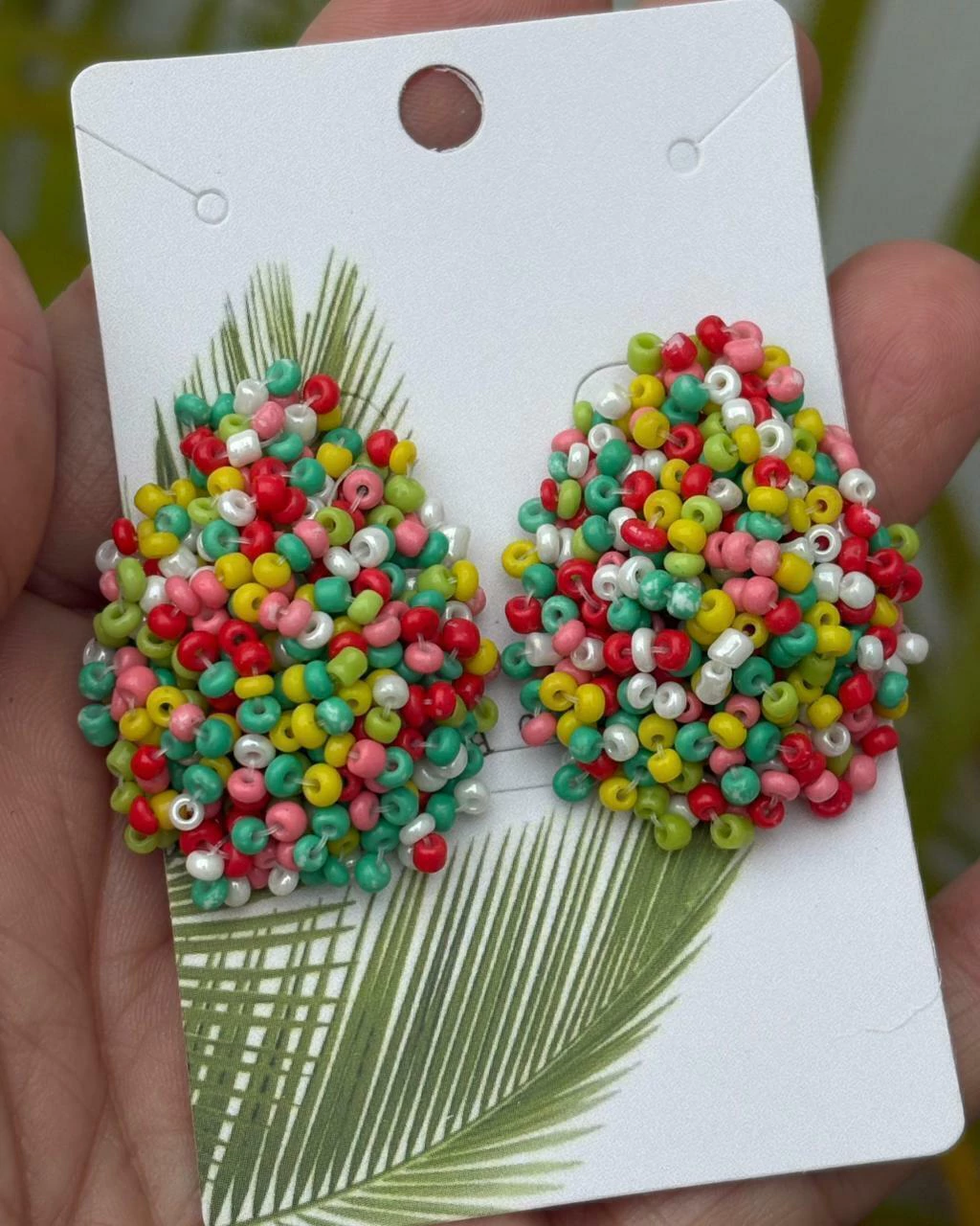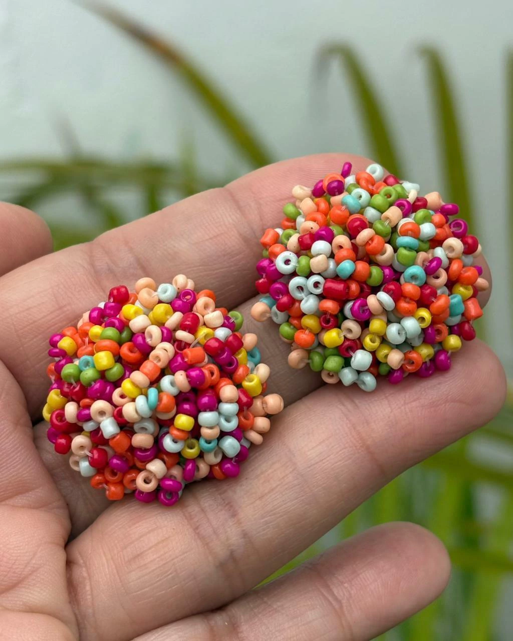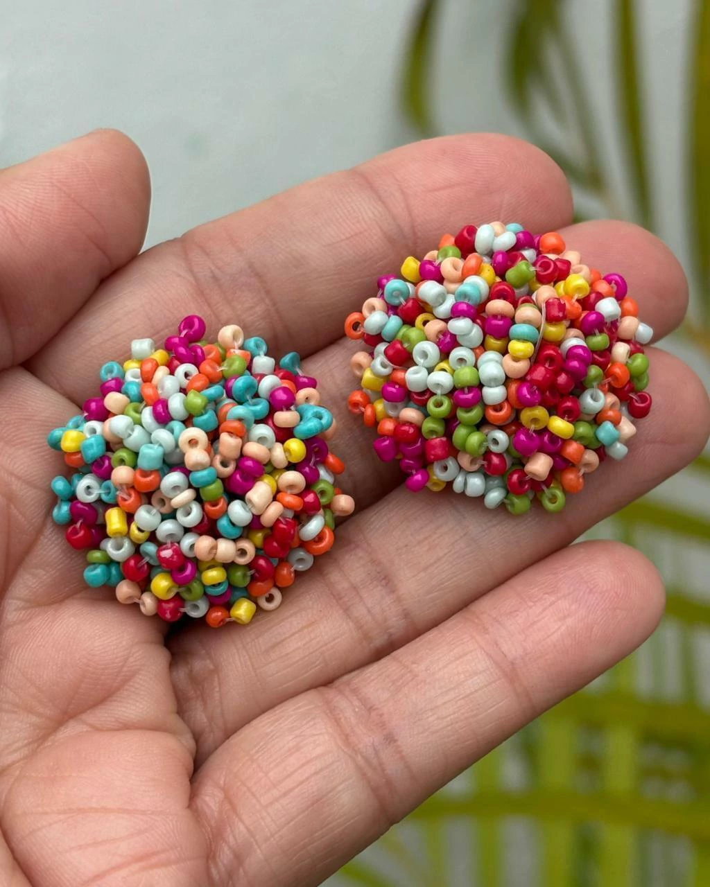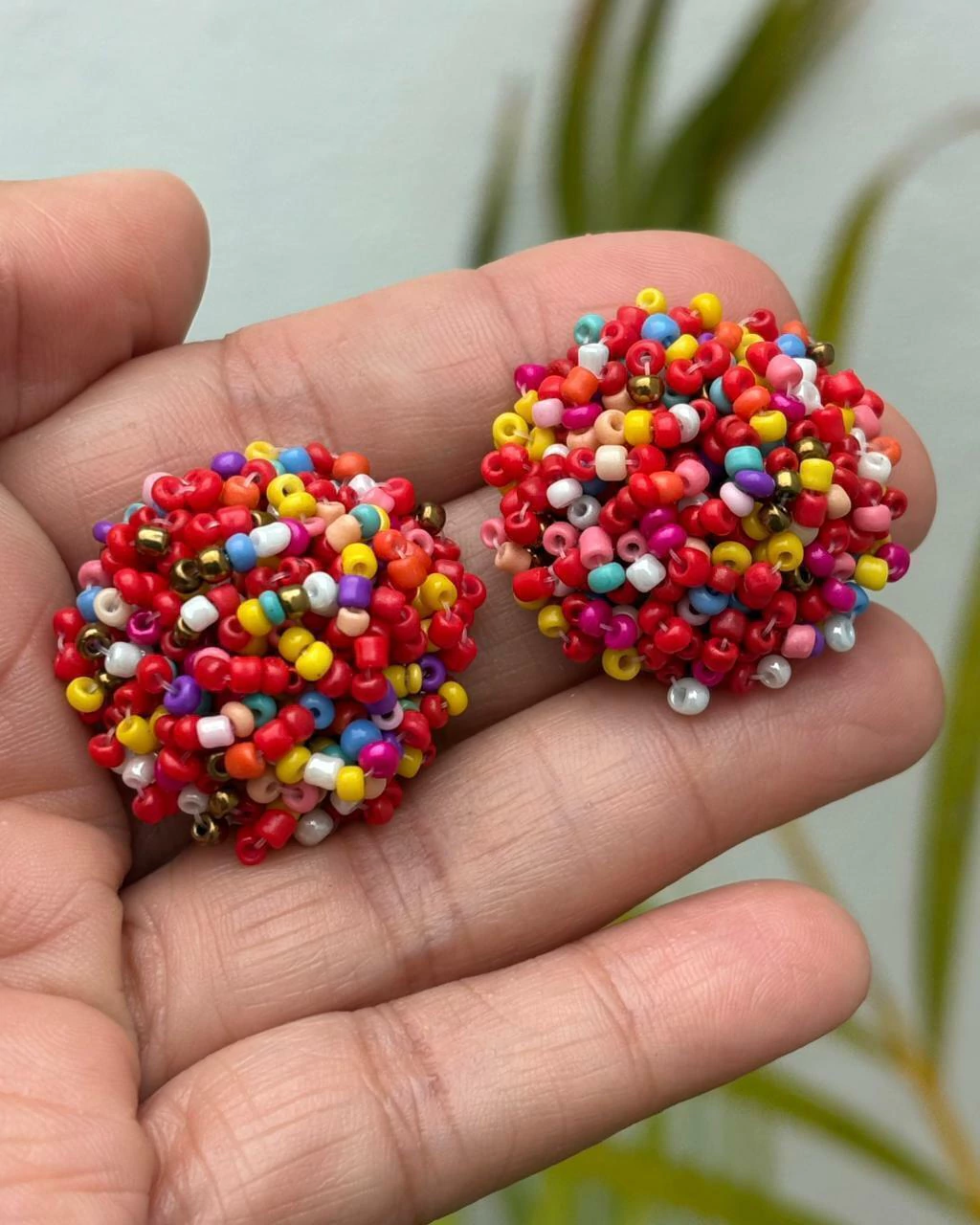 Em formato de botão revestido por miçangas.