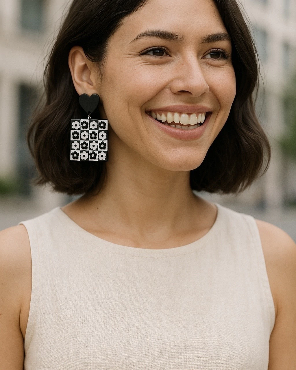 Brinco Preto e Branco em Resina Estilo Retrô com Flores e Coração 🌸❤️