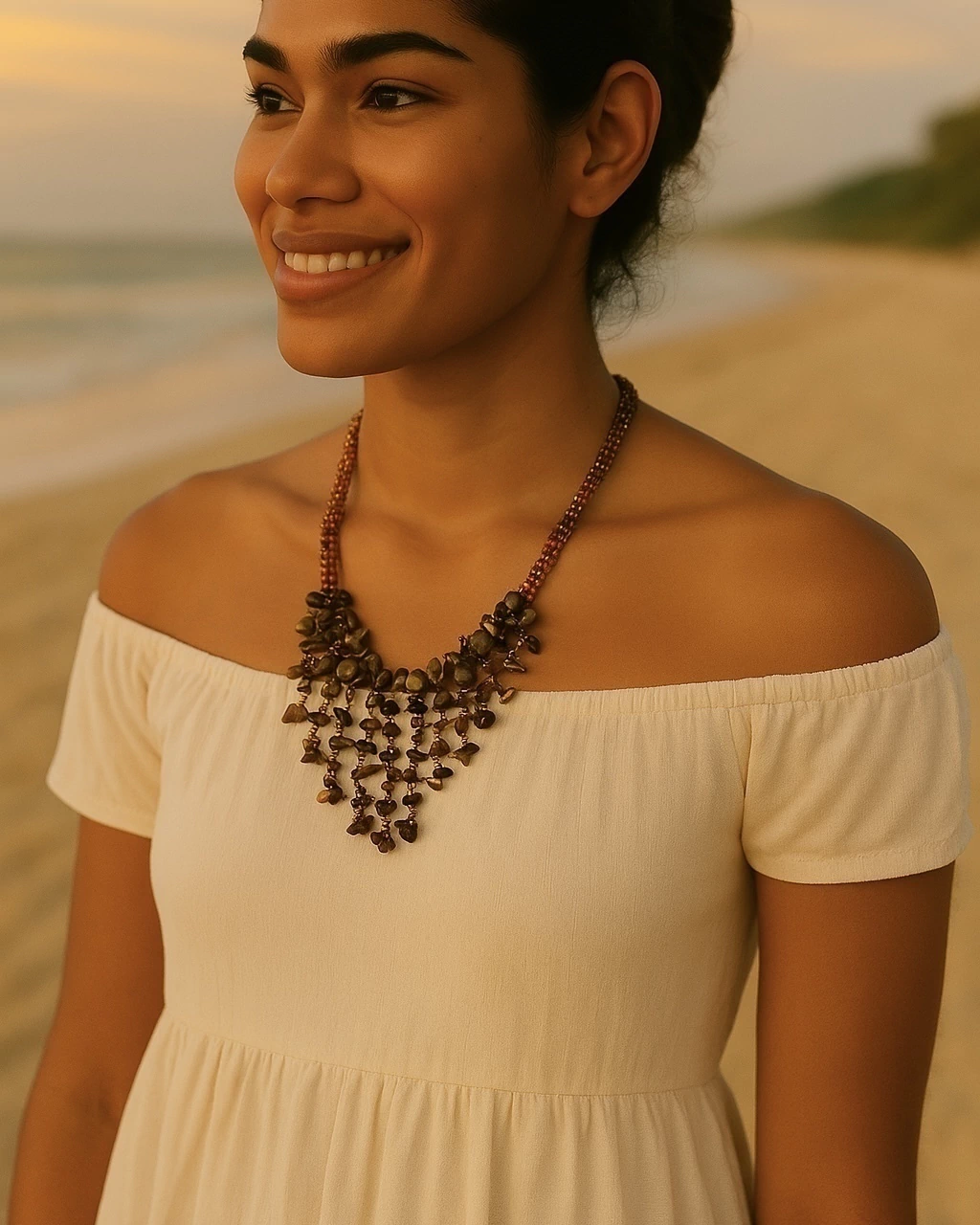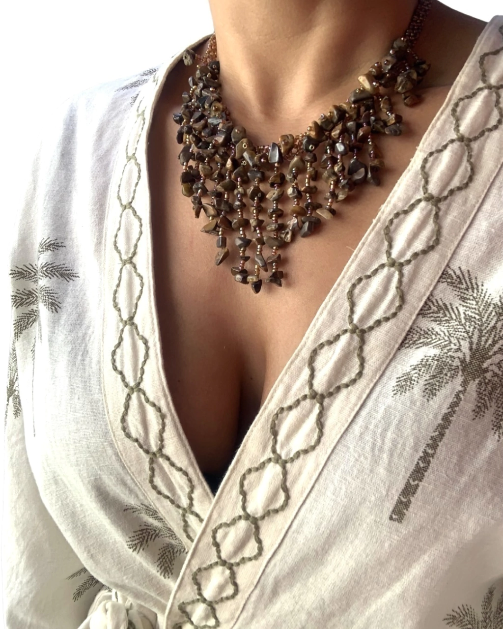 Você já pensou em ter um colar que não só é lindo, mas também faz você se sentir como uma verdadeira diva? Com 55 cm de pedras e miçangas em vidro, o Colar Jade em Cascalho Olho de Tigre é a escolha perfeita para quem quer arrasar no visual, seja na praia ou em um passeio casual.